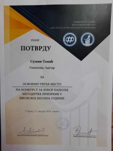 Центар за професионално усавршавање Филозофског факултета Универзитета у Нишу и ове школске године је расписао конкурс за најбољу методичку припрему из области филолошких и друштвено-хуманистичких наука. Комисија за процену квалитета припрема из области друштвено-хуманистичких наука доделила је награду за освојено 3. место наставници историје Сузани Томић, која је урадила припрему на тему Балкански ратови. Честитамо!