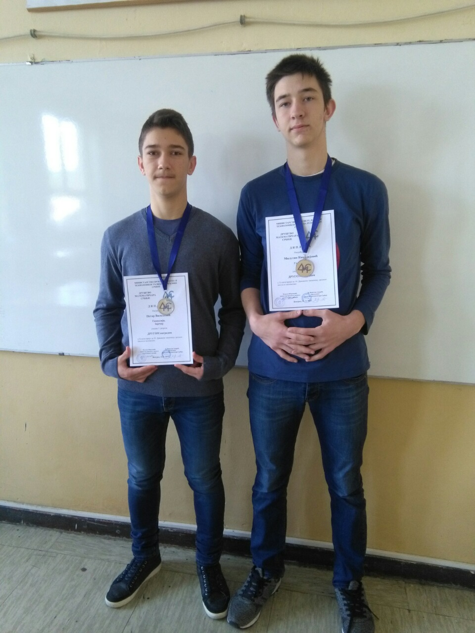 Na Državnom takmičenju iz matematike za srednje škole, koje je održano 11.3.2017. u Beogradu u Devetoj beogradskoj gimnaziji „Mihajlo Petrović – Alas“, našu školu predstavljali su Petar Vasiljević i Milutin Nikodijević (I4), Luka Ćirić (III4) i Marijana Cvetković (IV4). Čestitamo našim učenicima a posebno Petru Vasiljeviću i Milutinu Nikodijeviću koji su ostvarili veliki uspeh i osvojili druge nagrade!